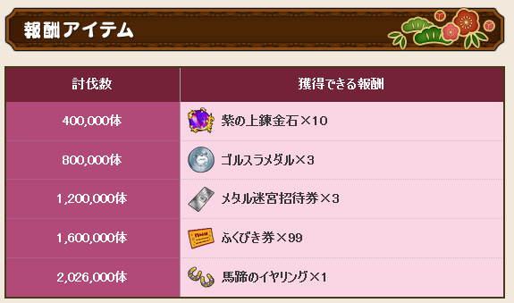 | 1,200,000体 | メタル迷宮招待券×3 |