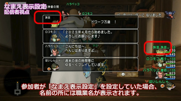 「なまえ表示設定」を「職業名」に設定すると、旅芸人→「旅芸」のような職業の短縮名で表示されます。
