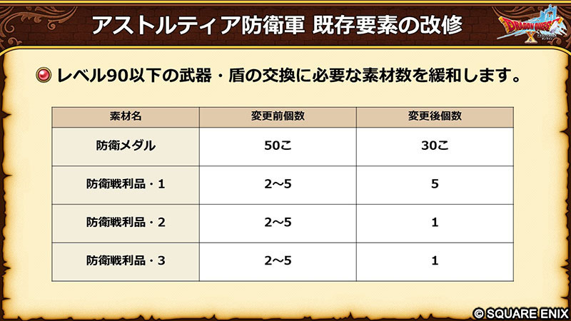 Lv90以下の武器盾の交換に必要な素材数を緩和。