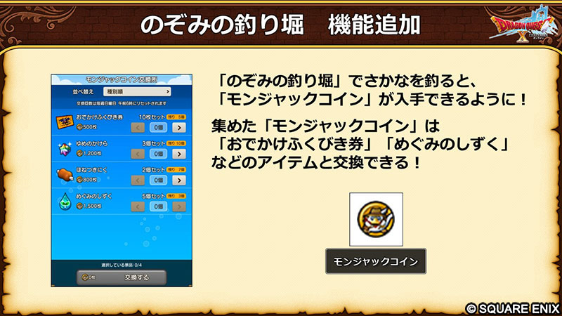・のぞみの釣り堀で魚を釣ると「モンジャックコイン」を獲得。便利ツール内で使えるアイテムと交換可能。