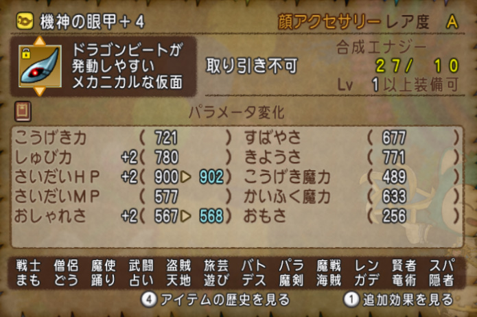 結論:機神の眼甲理論値を破壊神の眼甲に伝承すると、HPは8増え、敵を倒すとためるが5%増えましたが、「味方死亡時聖女」は減りました。