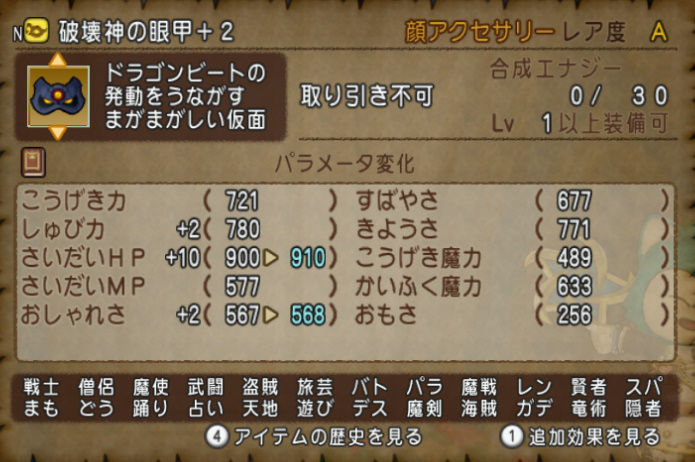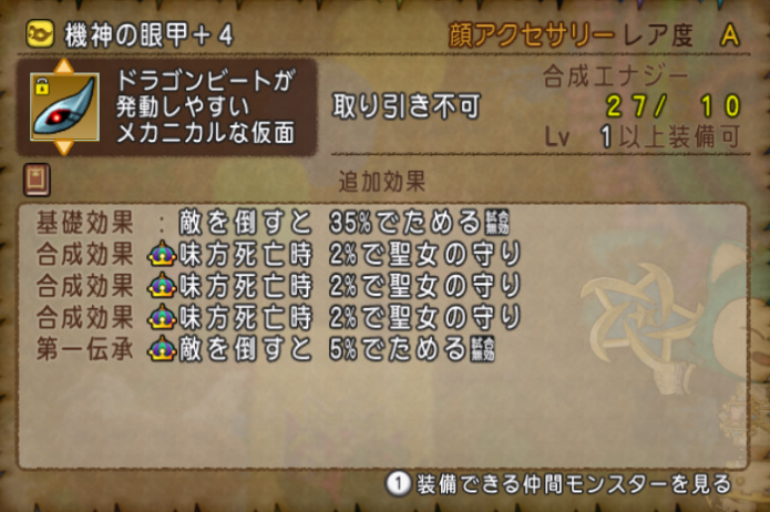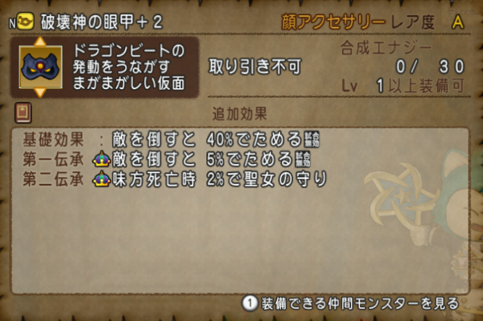 下位アクセより性能が下がるとは考えにくいので、今後おそらく破壊神の眼甲同士の合成で「味方死亡時聖女2%」が付くと思われます。