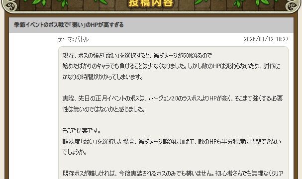 その他広場に初提案してきた! 広場に提案してきた! 初投稿! よく分かってないけど、こんな感じで良いのかな? 内容について 最近始めた人でも遊びやすいといいなあということで、 季節ボスで「弱い」を選んだら被ダメージだけでなくHPも減らしてほしい... 2026.01.12その他