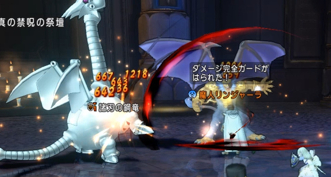 魔人リンジャーラはHPが減るごとに「樹縛の悪鬼2匹+炎業の妖星」「濁流の邪殻+砂塵の幻馬」「諸刃の鋼竜」を各1回ずつ召喚。面倒でもまずは取り巻きから倒していきましょう。特に諸刃の鋼竜はリンジャ―ラにダメージ完全ガードを付与してきます。