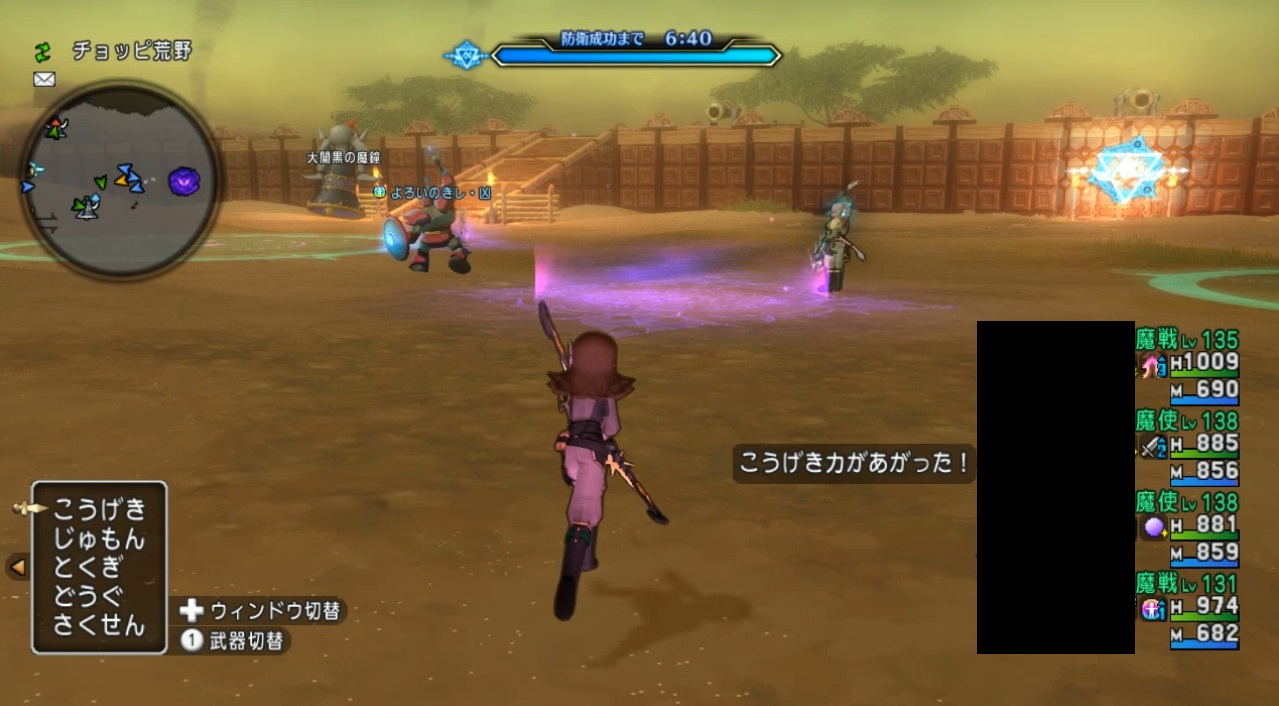 左右の端の方に闇の魔鐘と大闇黒の魔鐘が出現。沸き場所はランダムで、端っこに出ると気付きにくいので注意。これを見逃すとザコ敵を呼ばれ、6:20頃に門が襲われます。