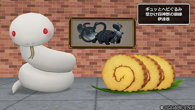 ぬいぐるみ屋ウーの店に家具「ギュッとヘビぐるみ」、新作家具屋ミヤの店に家具「壁かけ四神獣の額縁」「伊達巻」「破魔矢」と庭具「連凧」追加。額縁は「さわる」で絵を変更できます。