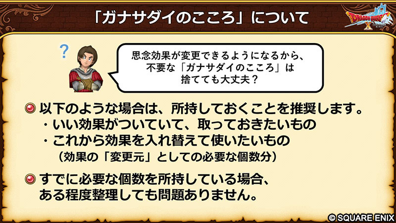 ガナサダイのこころは大量に持っておく必要はなく、付けたい効果の数と同じだけ残して残りは捨ててもOK。今後「ガナサダイのこころ+2」が出現する予定もないとのこと。