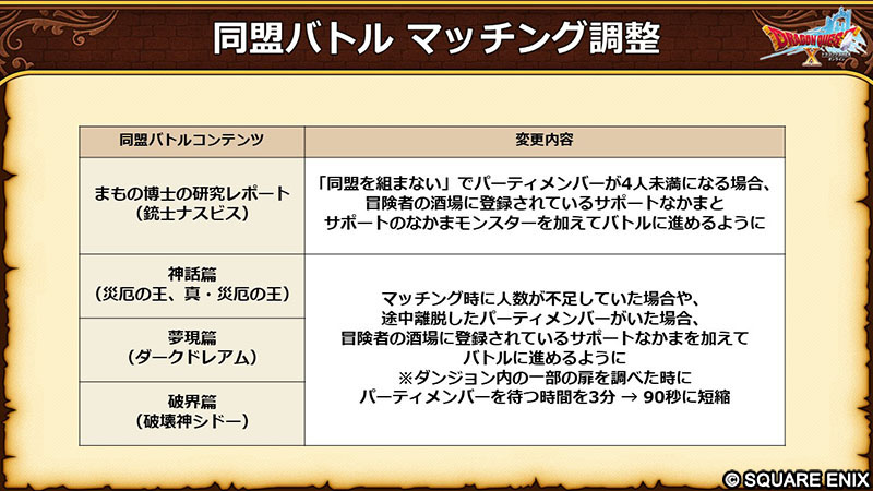 強戦士の書から行ける同盟バトルが対象。マッチング時に人数が不足していた場合、酒場のサポート仲間が追加されるようになります。